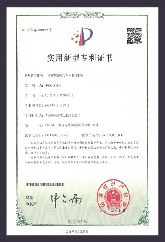 ?水位控制器專利證書